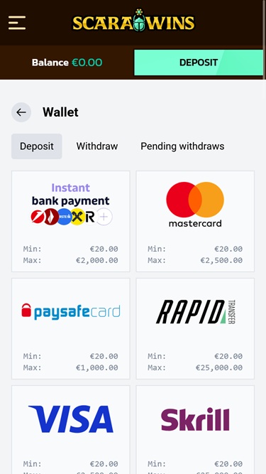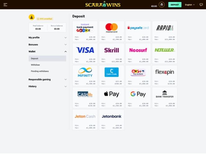 لمن يتساءلون عما إذا كان كازينو سكاراوينز يقبل حلول العملات المشفرة، فالجواب للأسف هو لا. لكن قسمهم المالي يقدم العديد من طرق الدفع الشائعة، بما في ذلك Apple Pay، والتحويل البنكي، و MiFinity ، وSkrill، وNeteller، وVisa، وMasterCard، على سبيل المثال لا الحصر.