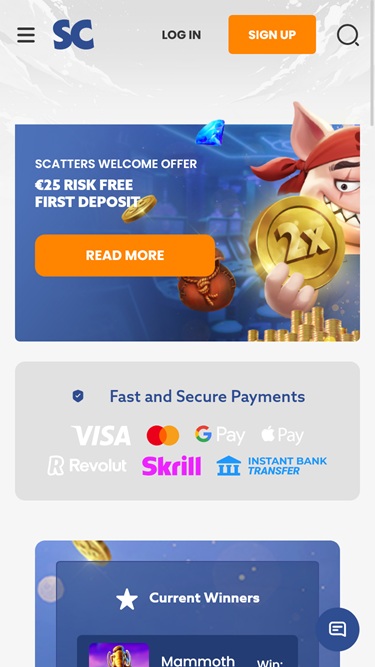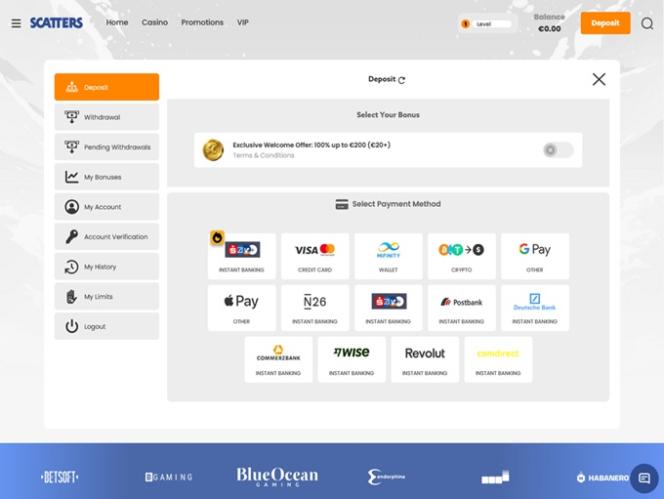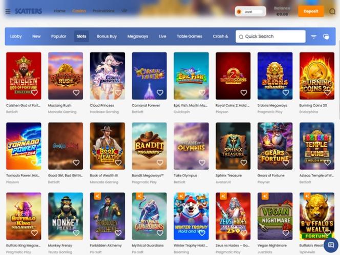 يعمل موقع Scatters بواسطة BetSoft, Ezugi, Habanero Systems, Play'n GO, playson, Quickspin, Thunderkick, Vivo Gaming, Yggdrasil, Endorphina, Wazdan, Pragmatic Play, Nolimit City, Spinomenal, Red Rake Gaming, Platipus Gaming, BGAMING, Fazi, Evoplay, Pocket Games Soft, Bulletproof Games, Gluck Games, Mancala Gaming, 7Mojos, HungryBear Gaming, UP Games, Tom Horn Gaming, BlueOcean Gaming, Reflex Gaming, Wild Streak Gaming, 4ThePlayer, AvatarUX, Gamevy, ReelPlay, Boomerang Studios, Hacksaw Gaming, Bang Bang Games, Peter And Sons, Absolute Live Gaming, Religa, TaDa Gaming, Winfinity, Spribe, 1spin4win, Reel Kingdom, NowNow Gaming, VoltEnt and Kitsune Studios ، وتُقدم ألعاب الكازينو عبر منصة ويب تُحمّل مباشرةً من خلال متصفح الإنترنت. يتميز الموقع بتصميم أنيق وسهل التصفح، كما يدعم الهواتف المحمولة، مما يتيح لك المقامرة عبر هاتفك الذكي أو جهازك اللوحي.