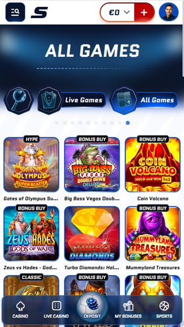 إلى جانب موقعه الإلكتروني الجذاب ذي التصميم الرائع، لا يتوانى هذا الموقع المخصص للمقامرة عن عرض جميع ألعابه وأنشطته. سيتمكن اللاعبون من الوصول إلى مكتبة تضم آلاف الألعاب، بدءًا من ماكينات القمار الإلكترونية، مرورًا بألعاب الموزعين المباشرين، وألعاب الطاولة، وصولًا إلى ألعاب الحظ الفورية.