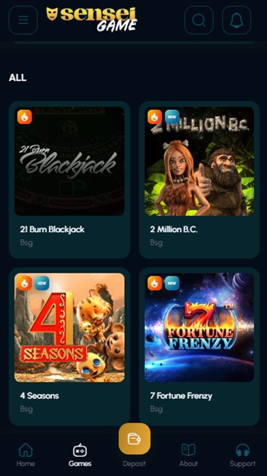 على الرغم من أن عوامل عديدة قد تؤثر على شعبية الكازينوهات الإلكترونية، إلا أن توفير مجموعة متنوعة وغنية من ألعاب القمار للاعبين أمرٌ بالغ الأهمية. يتعاون كازينو Sensei Game مع أكثر من مئة مطور برامج ، ويقدم محتوى عالي الجودة في مختلف الفئات.