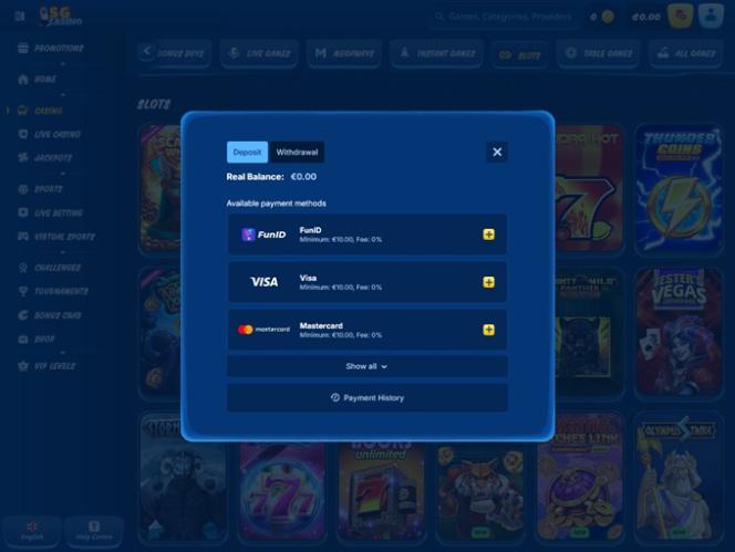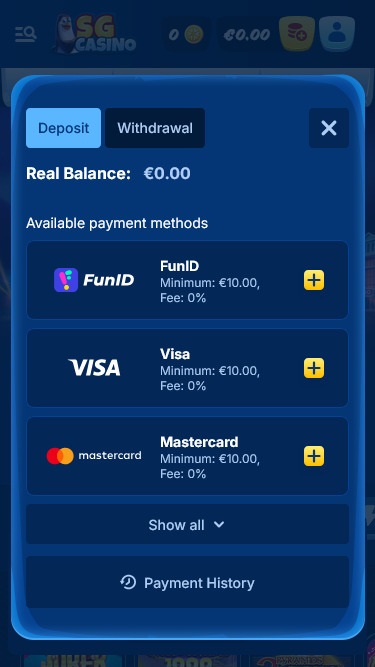 فيما يتعلق بالخدمات المصرفية، يقدم كازينو SG العديد من الحلول المتنوعة للإيداع. يمكن للاعب اختيار الدفع بالعملات المشفرة، وهو خيار شائع جدًا في الآونة الأخيرة. كما تتوفر خيارات دفع قياسية شائعة مثل ماستركارد، وستيك باي، وأسترو باي، وغيرها. ويمكن للاعبين أيضًا اختيار الإيداع عبر نيو سيرف إذا رغبوا في ذلك.