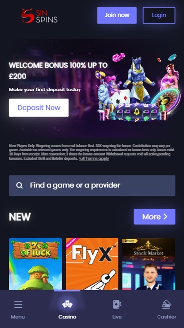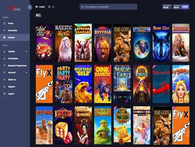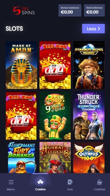 كازينو سين سبينز مدعوم من Microgaming, Net Entertainment, Playtech, 1x2gaming, Barcrest, Big Time Gaming, ELK Studios, Evolution Gaming, EYECON, lightningboxgames, Novomatic, Play'n GO, Rabcat, Thunderkick, Wazdan, Nolimit City, Red Tiger Gaming, Spinomenal, SYNOT Games, Skywind, Triple Edge Studios, Northern Lights Gaming, Stormcraft Studios, Switch Studios, All41 Studios, Gluck Games, Gameburger Studios, Pulse 8 Studios, Slot Factory, Neon Valley Studios, Shuffle Master, SpinPlay Games, Real Dealer Studios, GONG Gaming, On Air Entertainment, Buck Stakes Entertainment, Games Global, Blueprint Gaming, Greentube, Tom Horn Gaming, WMS, Inspired Gaming, SG Interactive, Red7Mobile, CORE Gaming, Scientific Games, Reel Time Gaming, Iron Dog Studio, Old Skool Studios, Foxium, Betdigital, Just For The Win, PearFiction Studios, Wild Streak Gaming, Slingshot Studios, Fortune Factory Studios, Gamevy, Crazy Tooth Studio, Alchemy Gaming, Black Pudding Games, Snowborn Games, Hacksaw Gaming, Gold Coin Studios, Half Pixel Studios, Aurum Signature Studios, Lucksome Gaming, Area Vegas, Wishbone Games, Circular Arrow, HammerTime Games, INO Games, Nailed It! Games, Neko Games, Reel Kingdom, Oros Gaming and Light & Wonder ، وتُقدم ألعابه عبر منصة لعب فوري على الإنترنت، تتيح للمستخدمين التسجيل والإيداع واللعب عبرها. كما يدعم الكازينو اللعب عبر الهاتف المحمول، ما يسمح لك باللعب عبر هاتفك الذكي أو جهازك اللوحي.المقامرة المسؤولة ودعم العملاء والأمان