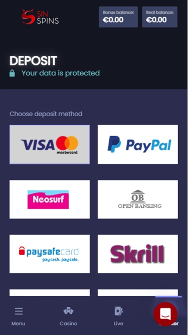 عند مراجعة الشروط والأحكام في كازينو سين سبينز، لم أجد أي شيء يُظهر ظلمًا واضحًا للاعبين. يوفر النظام المصرفي خيارات إيداع وسحب متعددة، مع أنني لا أحبذ وضع مهلة ثلاثة أيام لانتظار عمليات السحب.خيارات الخدمات المصرفية في Sin Spins Casino