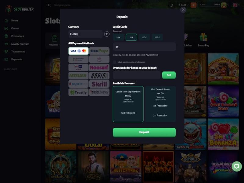 ستجد أدناه خيارات الخدمات المصرفية المختلفة المتاحة للاعبين في كازينو Slot Hunter.