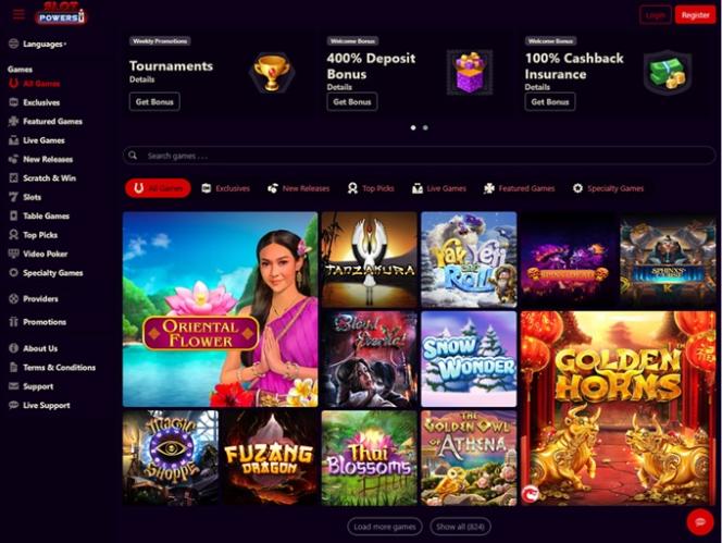 ماكينات القمار هي عنوان كازينو "سلوت باورز"، حيث يقدم الموقع عشرات من ماكينات القمار المرئية ذات السمات والميزات المتنوعة. كما تتوفر مجموعة صغيرة من ماكينات القمار الكلاسيكية، وإن كان عددها أقل بكثير من ماكينات القمار الحديثة ذات الخمس بكرات.برنامج نقاط المنافسة