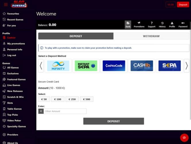 بالاطلاع على الشروط والأحكام في كازينو Slot Powers، يبدو أنه لا يوجد أي شيء غير عادي أو غير عادل للاعبين. النظام المصرفي جيد، حيث تتوفر عمليات الإيداع والسحب عبر Visa وNeteller وSkrill، كما يمكن إجراء الإيداعات عبر MasterCard وPaysafecard وUseMyBank. أوقات العمل المصرفي في Slot Powers جيدة، حيث تتم معالجة الإيداعات في غضون يومين إلى خمسة أيام. تجدر الإشارة أيضًا إلى وجود حد سحب يومي قدره 2000 دولار أمريكي وأسبوعي قدره 4000 دولار أمريكي.خيارات الخدمات المصرفية في Slot Powers