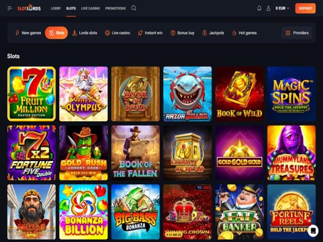 كما يوحي الاسم، يفخر كازينو SlotLords بمجموعة متميزة من ألعاب السلوتس الإلكترونية للاعبيه. تتوفر مئات الألعاب عالية الجودة التي ننصح كل محبي ألعاب السلوتس بتجربتها، وأكثرها شيوعًا هي:
