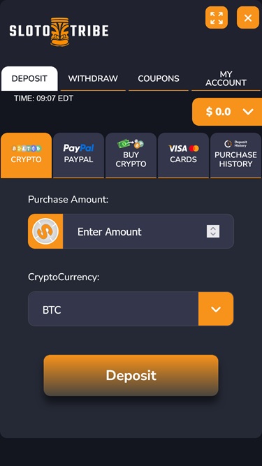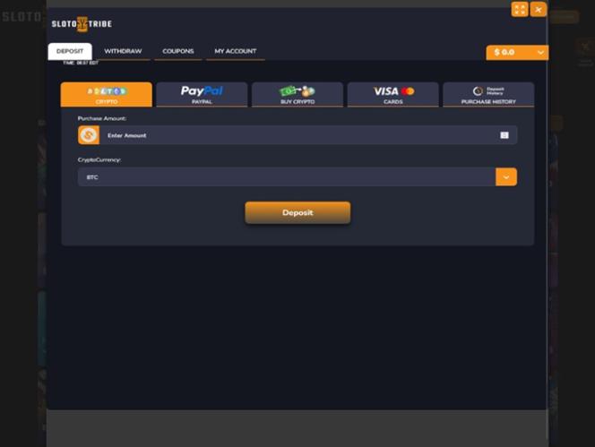 Bitcoin وBitcoin Cash وDogecoin وEthereum وLitecoin وSolana وTron وTether وUSD هي خيارات متاحة لمعاملاتك المالية في Sloto Tribe.