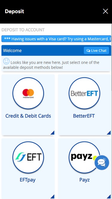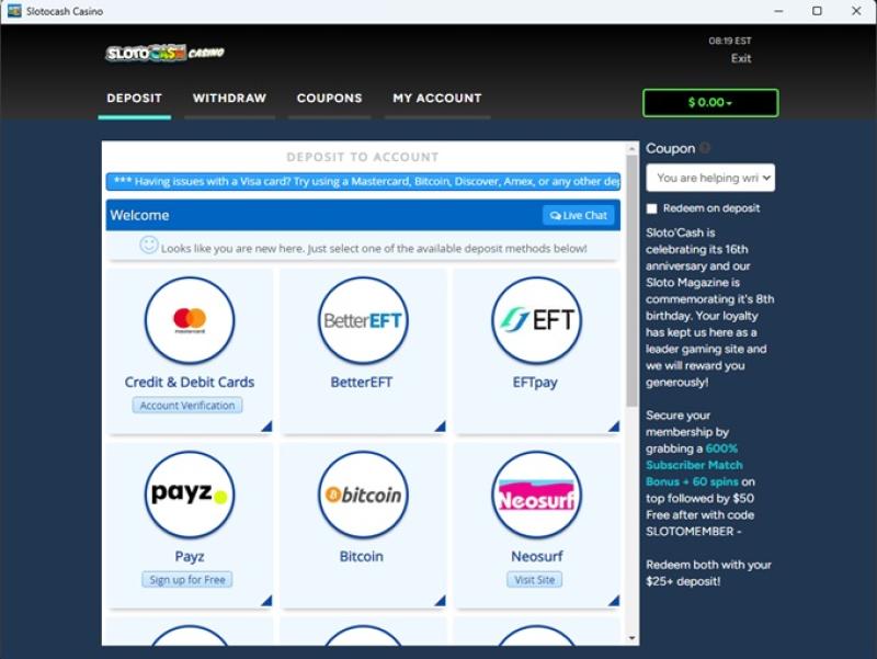 خيارات الخدمات المصرفية في Sloto'Cash Casino