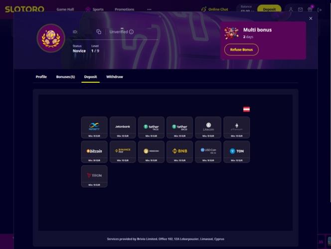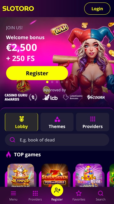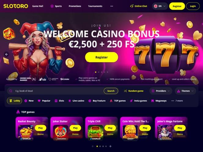 Slotoro هو موقع كازينو وموقع رياضي عبر الإنترنت تديره شركة مسجلة بموجب قوانين كوراساو وموجه للاعبين من ألمانيا وبولندا والنمسا وسويسرا.