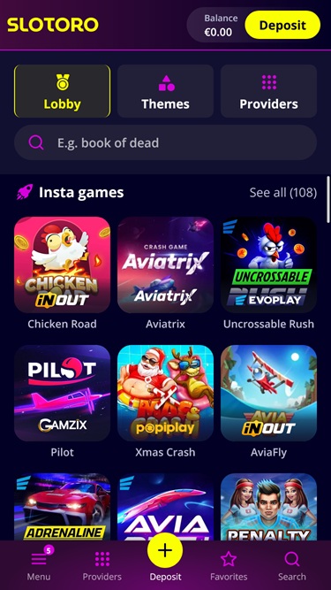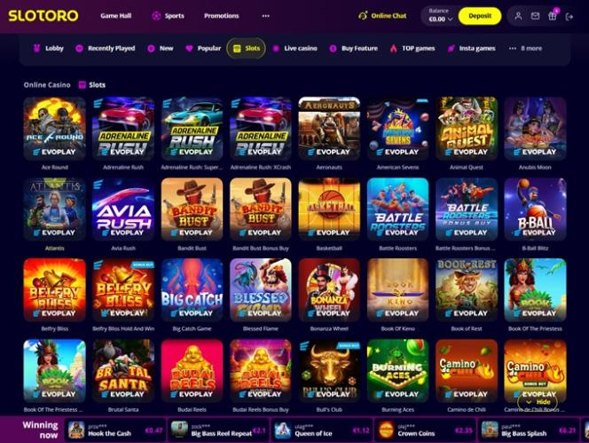 تعتمد مكتبة الألعاب الخاصة بالكازينو على Evoplay وGamzix وYggdrasil وSpinomenal و Evolution Gaming، وكما يمكنك أن تتخيل، يستضيف Slotoro أفضل ألعاب القمار على الإنترنت، ولكن يتم أيضًا اختيار فئات الألعاب الأخرى بعناية.