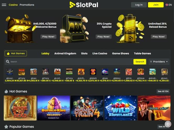 يضم هذا الكازينو أفضل ألعاب الكازينو المباشر ، بالإضافة إلى عروض الألعاب، وألعاب الطاولة ، والعديد من الألعاب والأنواع الأخرى التي تنتجها بعض أبرز شركات البرمجيات . ويُعدّ عدد المتعاونين مثيرًا للإعجاب، حيث يتعاون Slotpal مع أكثر من 120 علامة تجارية، بما في ذلك Microgaming وEvolution Gaming وQuickspin وRival وSpinomenal، وغيرها الكثير.