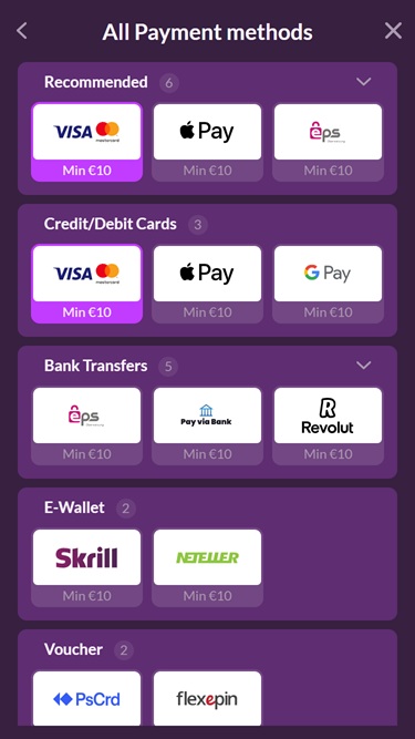 توفر المنصة عمليات الإيداع والسحب من خلال أفضل طرق الدفع المصرفية في العالم، بما في ذلك Apple Pay، والتحويل المصرفي، وGoogle Pay، وInterac، وNETELLER، وRapid Transfer، وRevolut، وRipple، وSkrill، وبطاقات الدفع، وأنظمة الخدمات المصرفية عبر الإنترنت الأخرى ...