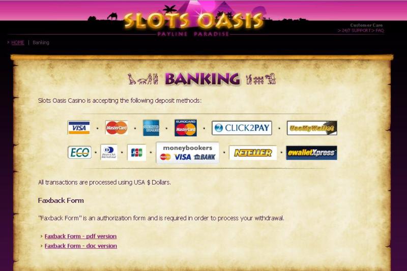 سلوتس أواسيس هو كازينو على الإنترنت يعمل بنظام Real Time Gaming and 21GNET . يتوفر الكازينو عبر برنامج قابل للتنزيل، بالإضافة إلى نموذج اللعب الفوري.خيارات الخدمات المصرفية في Slots Oasis