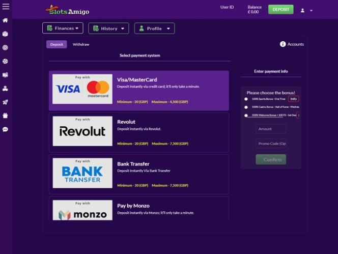 خيارات الخدمات المصرفية في SlotsAmigo Casino