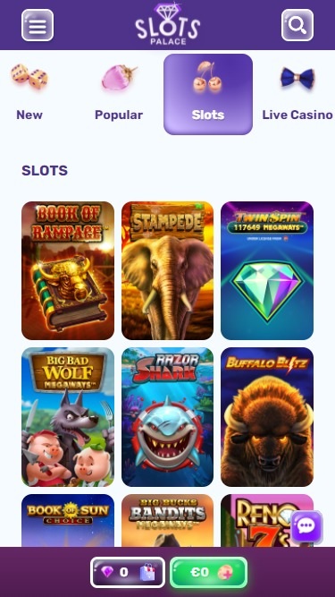 بعض العناوين الموصى بها في SlotsPalace هي: Book Of Rampage، Stampede، Twin $pin 117649 Megaways، Big Bad Wolf Megaways، Razor Shark، Buffalo Blitz، Book Of Sun Choice، Big Bucks Bandits Megaways، Reno 7s، Mystery Of Eldorado، San Quentin X Ways، Joker Win، Eye of Anubis، Gonzo's Gold، Fire In The Hole، Fat Drac، Siberian Wolf، Sakura Fortune، Black Wolf Hold And Win، Wolf Fang، Ramses Rising، Buffalo Power Hold And Win، Golden Glyph 2، Deadwood، Jammin' Jars، Sticky Bandits Wild Return، Vikings Go Berzerk، Book Of Diamonds، Fire Blaze Jackpots Blue Wizard، Shining Crown، Tiger`s Glory، 10000 Wishes، Hallow Pick، Super Sevens & Fruits 6 Reels، Bankin` Bacon، Dark Reels، Atlantis جمع Ca$H، خدش ثروة الهالوين، مسار البدر البري، القرع الرجعي، Gator Gold Gigablox، ثروات Midgard Land And Expand، روما العصر الذهبي، كتاب الإكسير، كتاب هور، Conquestera، الوحش الخطير، الحظ الخامس، الحظ الثالث، الأسد الهائج، عرش كاميلوت، القبيلة، المفاعل الذري، اللورد فورتشن 2 - امسك واربح، قصة هرقل...