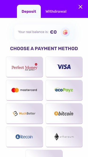 واجهة الكازينو مُحسّنة لمنصات متعددة، وتناسب جميع أجهزة الكمبيوتر والهواتف المحمولة. تتميز بتصميم ساطع بفضل قالب الوضع المضيء، لكنها نابضة بالحياة بفضل تصميمها الذي يعتمد على أشكال ثلاثية الأبعاد ملونة مع نمط تصميمي باللونين الأرجواني والذهبي.