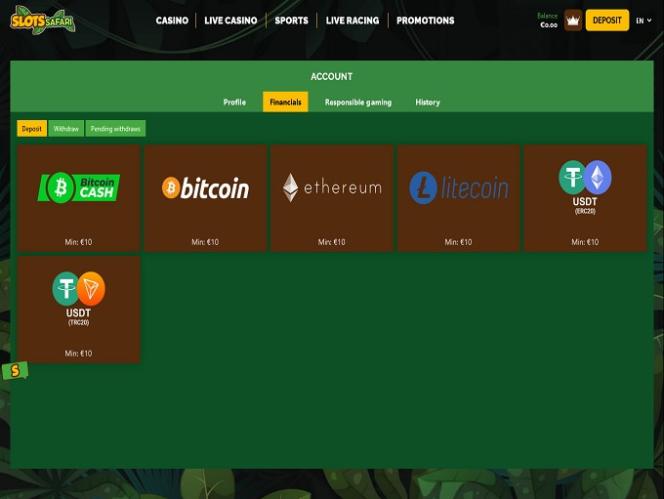 يدعم موقع SlotsSafari العديد من طرق الدفع المشفرة الشائعة، ولكن في حالة رغبتك في استخدام خيارات دفع أخرى، لاحظ أنه في هذا الكازينو، من الممكن استخدام بطاقات دفع معينة فقط.