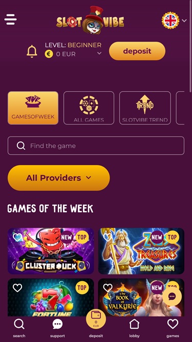 الردهة منظمة بشكل جيد، مع ألعاب مُرتبة حسب الأنواع: ماكينات القمار، والألعاب المباشرة،وألعاب بيتكوين ، وألعاب الورق، والألعاب المميزة، والجديدة، والجوائز الكبرى. بالإضافة إلى ذلك، يُمكنك تصفح الدليل حسب المُزوِّد.