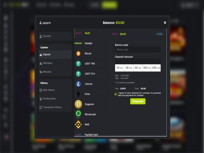 في SolisBet، يمكن للمقامرين الاعتماد على معاملات دفع سريعة عبر مجموعة واسعة من وسائل الدفع المتاحة، بما في ذلك العملات المشفرة، وبطاقات الائتمان والخصم، والمحافظ الإلكترونية، وغيرها من وسائل الدفع عبر الإنترنت. يُرجى العلم أن مدة معالجة السحب قد تصل إلى ثلاثة أيام.