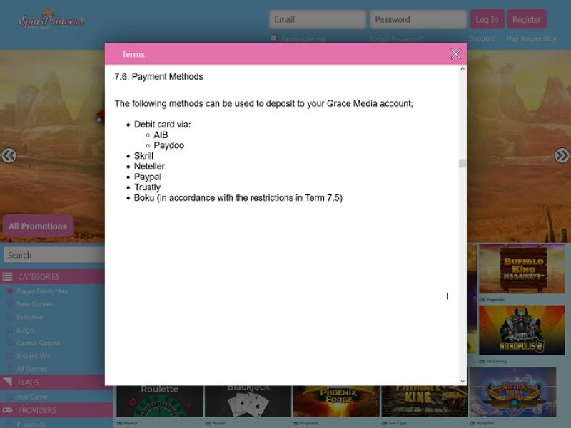 لا يقبل موقع Spin Princess اللاعبين من البلدان التالية: أفغانستان, ألاباما, جزر آلاند, ألاسكا, ألبانيا, ألبرتا, ألديرني, الجزائر, ساموا الأمريكية, أندورا, أنغولا, أنغيلا, القارة القطبية الجنوبية, أنتيغوا وباربودا, الأرجنتين, أريزونا, أركنساس, أرمينيا, أروبا, أستراليا, النمسا, أذربيجان, جزر البهاما, البحرين, بنغلاديش, بربادوس, بيلاروسيا, بلجيكا, بليز, بنين, برمودا, بوتان, بوليفيا, البوسنة والهرسك, بوتسوانا, جزيرة بوفيت, البرازيل, كولومبيا البريطانية, إقليم المحيط الهندي البريطاني, بروناي, بلغاريا, بوركينا فاسو, بوروندي, كاليفورنيا, كمبوديا, الكاميرون, كندا, الرأس الأخضر, جزر كايمان, جمهورية أفريقيا الوسطى, تشاد, تشيلي, الصين, جزيرة الكريسماس, جزر كوكوس (كيلينغ), كولومبيا, كولورادو, جزر القمر, الكونغو, جمهورية الكونغو الديمقراطية, كونيتيكت, جزر كوك, كوستاريكا, ساحل العاج, كرواتيا, كوبا, كوراساو, قبرص, الجمهورية التشيكية, دي سي, ديلاوير, الدنمارك, جيبوتي, دومينيكا, جمهورية الدومينيكان, الإكوادور, مصر, السلفادور, غينيا الاستوائية, إريتريا, إستونيا, أثيوبيا, جزر فوكلاند (مالفيناس), جزر فارو, فيجي, فنلندا, فلوريدا, فرنسا, غيانا الفرنسية, بولينيزيا الفرنسية, الأقاليم الجنوبية الفرنسية, الجابون, غامبيا, جورجيا, جورجيا, ألمانيا, غانا, جبل طارق, اليونان, جرينلاند, غرينادا, غوادلوب, غوام, غواتيمالا, غينيا, غينيا بيساو, غيانا, هايتي, هاواي, جزيرة هيرد وجزر ماكدونالد, هندوراس, هونغ كونغ, هنغاريا, أيسلندا, أيداهو, إلينوي, الهند, إنديانا, أندونيسيا, أيوا, إيران, العراق, أيرلندا, جزيرة مان, إسرائيل, إيطاليا, جامايكا, اليابان, جيرسي, الأردن, كانساس, كازاخستان, كنتاكي, كينيا, كيريباتي, كوريا، جمهورية كوريا الديمقراطية الشعبية, جمهورية كوريا, الكويت, قيرغيزستان, لاوس, لاتفيا, لبنان, ليسوتو, ليبيريا, ليبيا, ليختنشتاين, ليتوانيا, لويزيانا, لوكسمبورغ, ماكاو, مدغشقر, مين, ملاوي, ماليزيا, جزر المالديف, مالي, مالطا, مانيتوبا, جزر مارشال, مارتينيك, ماريلاند, ماساتشوستس, موريتانيا, موريشيوس, مايوت, المكسيك, ميشيغان, ميكرونيزيا، ولايات الاتحاد, مينيسوتا, ميسيسيبي, ميسوري, مولدوفا, موناكو, منغوليا, مونتانا, الجبل الأسود, مونتسيرات, المغرب, موزمبيق, ميانمار, ناميبيا, ناورو, نبراسكا, نيبال, هولندا, جزر الأنتيل الهولندية, نيفادا, نيو برونزويك, كاليدونيا الجديدة, نيو هامبشاير, نيوجيرسي, نيو مكسيكو, نيويورك, نيوزيلندا, نيوفاوندلاند ولابرادور, نيكاراغوا, النيجر, نيجيريا, نيوي, جزيرة نورفولك, كارولينا الشمالية, داكوتا الشمالية, مقدونيا الشمالية, جزر ماريانا الشمالية, الأقاليم الشمالية الغربية, النرويج, نوفا سكوشا, نونافوت, أوهايو, أوكلاهوما, عُمان, أونتاريو, أوريغون, باكستان, قصر, فلسطين, بنما, بابوا غينيا الجديدة, باراغواي, بنسلفانيا, بيرو, فيلبيني, بيتكيرن, بولندا, البرتغال, جزيرة الأمير إدوارد, بورتوريكو, قطر, كيبيك, جمع شمل, رود آيلاند, رومانيا, روسيا, رواندا, سانت هيلينا, سانت كيتس ونيفيس, سانت لوسيا, سانت مارتن, سان بيير وميكلون, سانت فنسنت وجزر غرينادين, ساموا, سان مارينو, ساو تومي وبرينسيبي, ساسكاتشوان, المملكة العربية السعودية, السنغال, صربيا, سيشل, سيراليون, سنغافورة, سلوفاكيا, سلوفينيا, جزر سليمان, الصومال, جنوب أفريقيا, كارولينا الجنوبية, داكوتا الجنوبية, جورجيا الجنوبية وجزر ساندويتش الجنوبية, جنوب السودان, إسبانيا, سريلانكا, السودان, سورينام, سفالبارد ويان ماين, سوازيلاند, السويد, سويسرا, سوريا, تايوان, طاجيكستان, تنزانيا, تينيسي, تكساس, تايلاند, تيمور الشرقية, توغو, توكيلاو, وصل, ترينيداد وتوباغو, تونس, ديك رومى, تركمانستان, جزر تركس وكايكوس, توفالو, أوغندا, أوكرانيا, الإمارات العربية المتحدة, الولايات المتحدة, جزر الولايات المتحدة الصغيرة النائية, أوروغواي, يوتا, أوزبكستان, فانواتو, الفاتيكان, فنزويلا, فيرمونت, فيتنام, جزر في