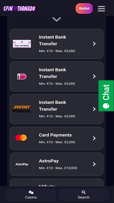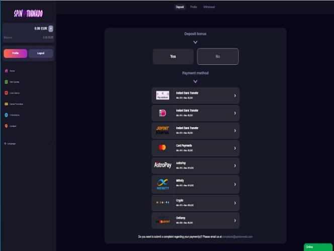 خيارات الخدمات المصرفية في Spin Tornado Casino