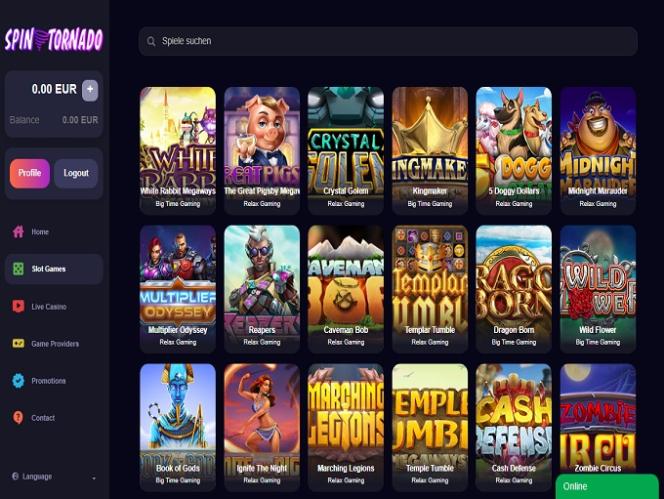 فيما يلي بعض العناوين التي يمكنك تجربتها في Spin Tornado: Land of Zenith و Dinopolis و Booty Bay و Jammin' Jars 2 و Wheel of Wonders و Mount Magmas و Crystal Catcher و Retro Tapes و Fat Drac و Goat Getter و Bison Battle و 10 Swords و Mad Cars و Dino PD و Razor Returns و Blaze of Ra و Mystery Mission To the Moon و Fat Rabbit و Rat King و Fat Santa و Fire Hopper و Fat Banker و Big Bamboo و Nightfall و Jammin' Jars و Mystery Museum و Power Force Heroes JP و Power Force Villains JP و Razor Shark و Space Stacks و Generous Jack و The Shadow Order و Tiki Tumble و Viking Clash و Wild Swarm و Joker Troupe و Giga Jar و Deadly 5 و Video Blackjack و Imperial Quest و Extra Chili Epic Spins و Grand Korean Blackjack و Bonsai Baccarat A و Bonsai Baccarat B و Bonsai Baccarat C، باكارات سريعة كورية F، باكارات سريعة بالإسبانية، استوديو كرة القدم بالإسبانية، وقت رائع، أعلى من فالهالا، يو هو جولد، أضواء الديسكو، جنة السكر، همسات ليلة ملكة الغابة، كاش جوكر، ذهب حورية البحر، مصيدة السلطعون، روك آند ريلز، بركان كوين، هوت جوكر فروتس، صعود أتلانتس 2، جنون متجر الفواكه، أسطورة نزهة، سيتي بوب هاواي، ملوك الحانات، صيد ضخم من القارب بونانزا، وين-أو راما XL، فروتس رويال، 6 في الغرفة، براميل كاش بوت ميجاوايز، إعادة تدوير علاء الدين، تاج مذهل، مكافأة الماس 7، امسك واربح، لاكي بوركر، كتاب الجماجم: كنز مجهول، كنوز سافانا، 20 لعبة رائعة، هوغو ليجاسي، نجوم سرية، مصنع القمار، بينجو تيسورو مايا، قفل الفايكنج، ماكينات القمار أو كاش بوت، نوستراداموس. مايتي خان، صعود فينيكس البري، قصة جايا، قصة حب تعويذة أفروديت، التاج والماس: تمسك واربح، الجد النعسان، التاج الملكي 50، بوكي فيغاس، صندوق اللحى الزرقاء، ضوء رع، بونانزا الأرنب، فينيكس أب كاش، عملات ملحمية، متعة الساموراي، بسكويت جائع، جريزميرالدا، فوكستروت، تيكي تايم إكزوتيك وايلدز، 777 إلكترو سبين، كابتن شمب، المزيد من التفاحة السحرية، قصة جاربتيتسا، مجلد الساحرات، اللص، درب موستانج، كنوز الياقوت، دروبهم، آلة البيع، سيزلينج بليز ديلوكس، شمس مايا، روح الغابة، جواهر النمر تمسك واربح، سيد البحار، كتاب الملك المهيب، طرق ساخنة متعددة، صيادو الأفق، تناول وجبة خفيفة، الشمس الحارقة الخفيفة للغاية، سحق العملاق، فرحة المهرجين، صيد سمك القاروص الكبير، حانات ميجا، ابحث عن ملك الجائزة الكبرى للسيدة، محظوظ الشعاب المرجانية، سحر الفراشات، المزرعة البرية، ناب الذئب، غارة المكافأة 2، دوائر الجحيم التسع، فاكهة الفقاعات الـ27، غنيمة راس الذهبية، الغوص في لعبة الجولف الخارقة، 99 متعدد، المواجهة، وقت الباندا، قوة شاولين، 101 متعدد، سيد الموت، اندفاع العسل 100، القطط الذرية، ضربة السافانا، 243 طريقة للفاكهة والمزيد.
