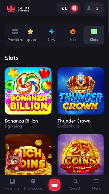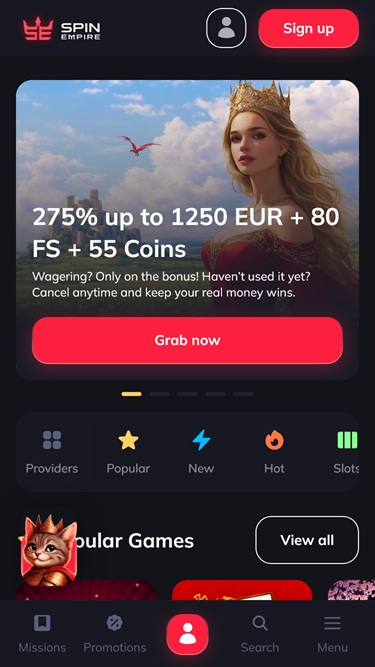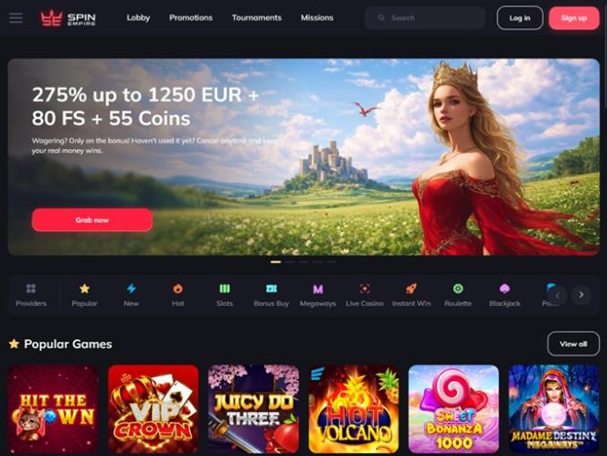 الموقع الإلكتروني متوفر باللغات الإنجليزية والدنماركية والألمانية والفرنسية والإيطالية. وهو متجاوب ومُحسَّن تمامًا للألعاب أثناء التنقل على الأجهزة المحمولة بجميع أحجام الشاشات. وإذا كنت تفضل أجهزة الكمبيوتر المكتبية، فستحظى بتجربة رائعة أيضًا. سنستعرض قريبًا خدمات الكازينو، فتابعونا، حيث أعدّت SpinEmpire عروضًا ترويجية مذهلة، وبطولات، وبرنامج ولاء، وغير ذلك الكثير لأعضائها.
