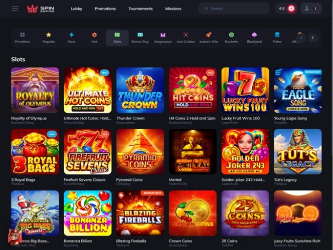 كما هو متوقع، فإن SpinEmpire هو كازينو على الإنترنت، وفقًا لاسم علامته التجارية، يتضمن مجموعة غنية من ألعاب السلوتس مع ما يقرب من خمسة آلاف عنوان ومحتوى جذاب سيقدره بالتأكيد عشاق هذه اللعبة الشهيرة.