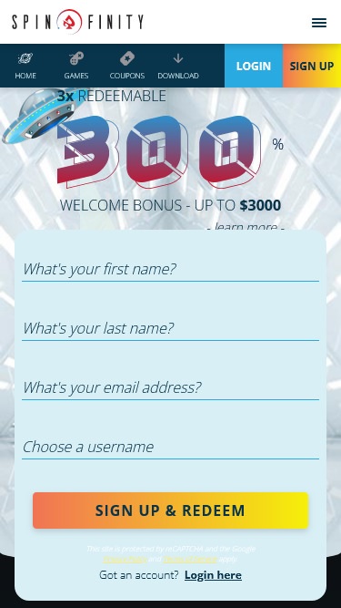 يعمل Spinfinity بواسطة Real Time Gaming, Visionary iGaming and Spinlogic Gaming ، وتُقدم ألعاب الكازينو عبر منصة ويب تُحمّل عبر متصفح الإنترنت. وجدتُ موقع الكازينو مُصممًا بشكل رائع، فهو سهل الاستخدام والتصفح. كما أنه يدعم الهواتف المحمولة، مما يسمح لك بالتسجيل واللعب باستخدام هاتفك الذكي أو جهازك اللوحي.المقامرة المسؤولة ودعم العملاء والأمان
