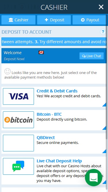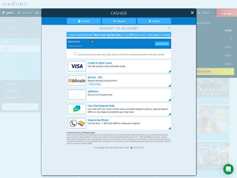 خيارات الخدمات المصرفية في Spinfinity Casino