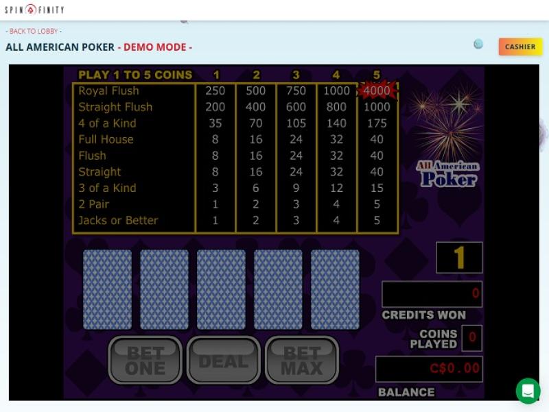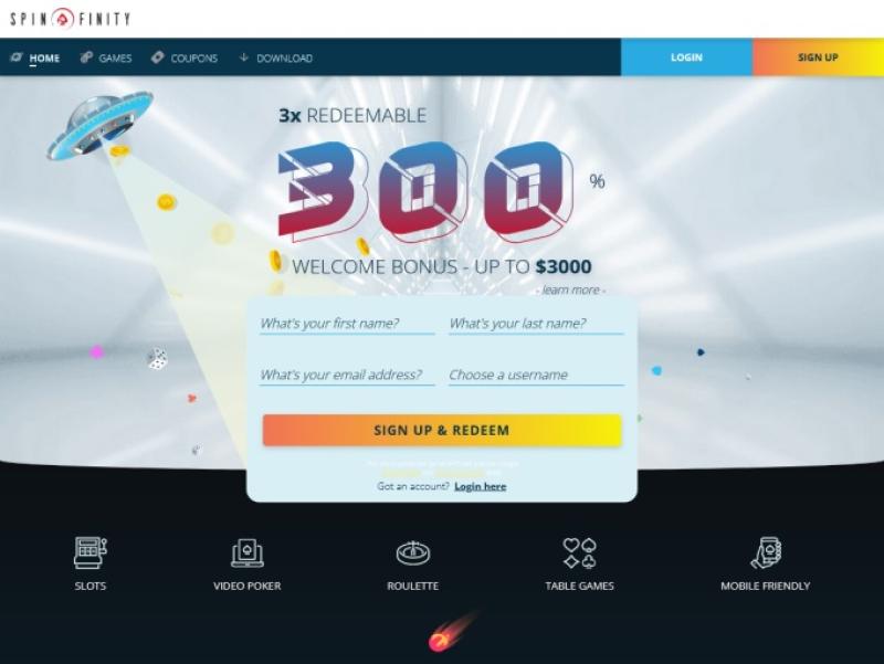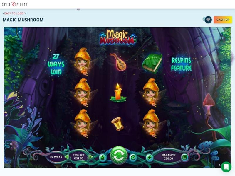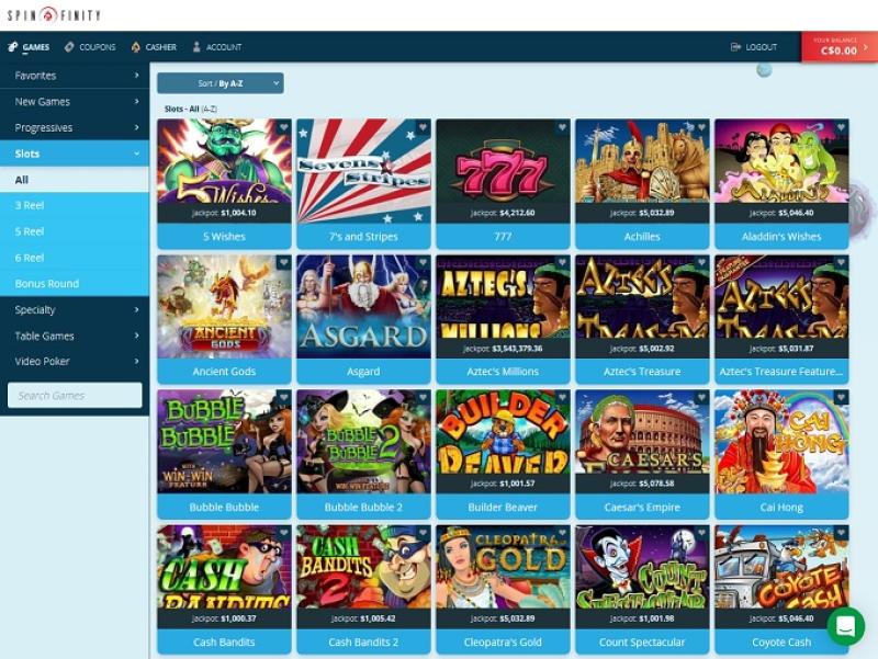 يقدم Spinfinity عددًا لا بأس به من ماكينات القمار بالفيديو، حيث تستخدم المجموعة منصة RTG التي تستخدمها العديد من الكازينوهات الأمريكية. كما يقدم العديد من ماكينات القمار الكلاسيكية، والتي توفر نسخًا بثلاث بكرات. تتوفر جوائز كبرى متزايدة، ومعظم الألعاب متوافقة مع الهواتف المحمولة.