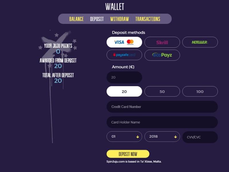 خيارات الدفع في Spin JuJu ممتازة، وإن كانت محدودة بعض الشيء، حيث يُتيح الموقع الإيداع والسحب عبر Visa وMasterCard وTrustly وNeteller. صحيح أن الخيارات المتاحة ليست كثيرة حاليًا، لكن الاستقرار الذي لمسناه لدى إدارة هذا الكازينو يُشير إلى أن كل شيء سيكون على ما يُرام من حيث موثوقية الدفع.