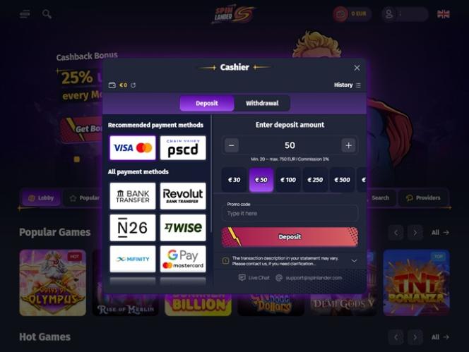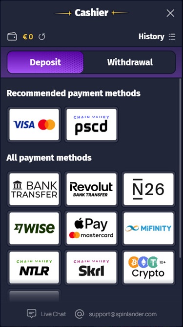 - يمكن للاعبين إيداع وسحب الأموال باستخدام العملات الورقية والعملات المشفرة.