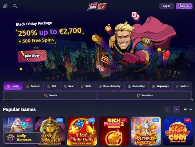 كازينو سبينلاندر هو موقع مقامرة حديث يقدم قائمة واسعة من أنشطة وألعاب الإنترنت. يمكن للاعبين تجربة آلاف ماكينات القمار بأموال حقيقية، وألعاب الطاولة، واللاعبين المباشرين، وخيارات الرياضات الافتراضية، كل ذلك مع إمكانية المشاركة في عروض ترويجية وفعاليات ومكافآت متنوعة. كما يقبل الكازينو العملات المشفرة مثل بيتكوين، بالإضافة إلى العديد من طرق الدفع التقليدية، مما يمنح اللاعبين مرونة مصرفية كبيرة.