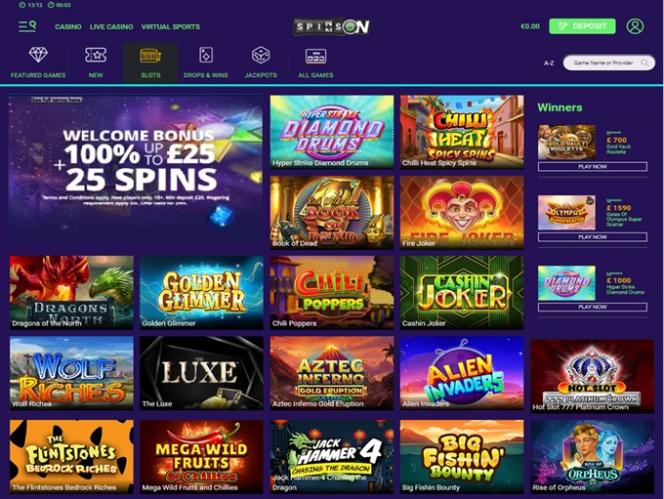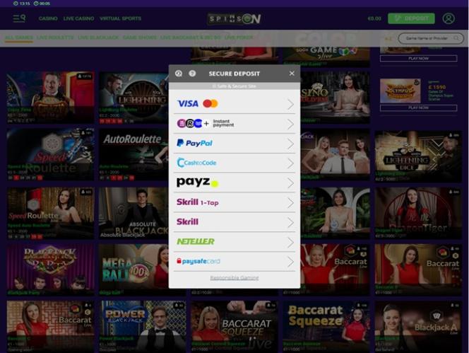 يتم تشغيل Spinson بواسطة Microgaming, Net Entertainment, BetSoft, 1x2gaming, Big Time Gaming, Evolution Gaming, EYECON, iSoftBet, lightningboxgames, Oryx, Play'n GO, Quickspin, Yggdrasil, Realistic Games, Booming Games, Stakelogic, Pragmatic Play, GAMING1, Red Tiger Gaming, Red Rake Gaming, Skillzzgaming, SYNOT Games, Skywind, Triple Edge Studios, Northern Lights Gaming, Switch Studios, All41 Studios, Gameburger Studios, Pulse 8 Studios, Neon Valley Studios, SpinPlay Games, HungryBear Gaming, Real Dealer Studios, Buck Stakes Entertainment, Games Global, Wizard Games, bluberi, Blueprint Gaming, NeoGames, Pariplay, Tom Horn Gaming, Inspired Gaming, Gaming Realms, Gamomat, Reel Time Gaming, Bally Wulff, Iron Dog Studio, Old Skool Studios, Foxium, Just For The Win, Reflex Gaming, PearFiction Studios, Wild Streak Gaming, Slingshot Studios, Fortune Factory Studios, 4ThePlayer, AvatarUX, Gamevy, Alchemy Gaming, Snowborn Games, Boomerang Studios, Hacksaw Gaming, Gold Coin Studios, Bang Bang Games, Slotmill, Lucksome Gaming, Area Vegas, Leap Gaming, GoldenRace, Wishbone Games, HammerTime Games, Nailed It! Games, Atomic Slot Lab, Neko Games, Reel Kingdom and Indigo Magic ، ويتم توفير ألعابه من خلال منصة تعتمد على الويب، مما يعني أنه يمكنك الوصول إلى الكازينو مباشرة من خلال متصفح الإنترنت الخاص بك.خيارات الخدمات المصرفية في Spinson