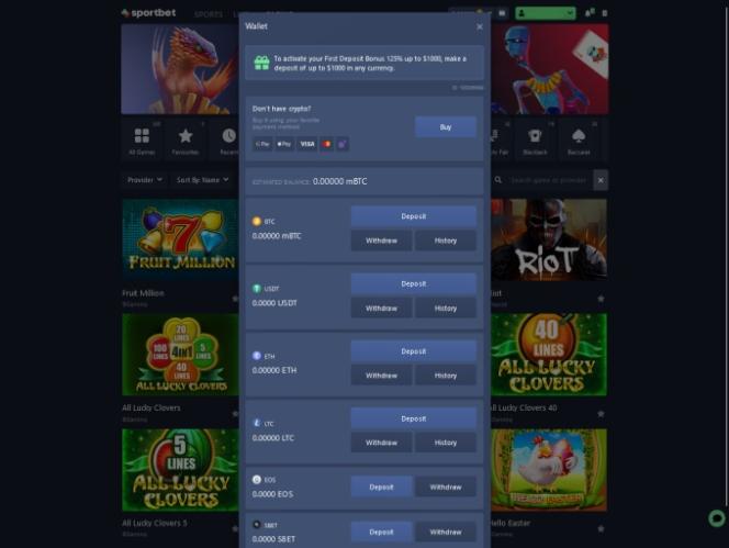 فيما يتعلق بالخيارات المصرفية، يُتيح كازينو سبورت بيت للاعبيه استخدام العملات المشفرة مثل بيتكوين ، وإي أو إس، وإيثريوم، ولايتكوين، وتيثر. تعتمد المنصة على تقنية بلوكتشين إي أو إس، مما يُتيح للاعبين والمراهنين إجراء معاملاتهم بحرية وسرية تامة في بيئة لامركزية، مع إمكانية تتبع كل شيء بأنفسهم.