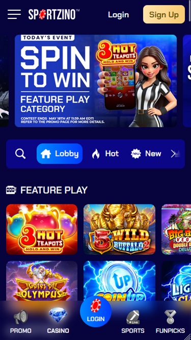 سبورتزينو منصة ألعاب اجتماعية تفاعلية، تتميز بعناصر مسابقات شيقة، مصممة لجذب جمهور الولايات المتحدة (مع بعض القيود الحكومية). تتميز المنصة بمجموعة متنوعة وواسعة من ألعاب الكازينو، بما في ذلك ماكينات القمار الإلكترونية، وألعاب كراش، وألعاب الصيد، بالإضافة إلى توفيرها لقسم مراهنات رياضية. تتاح للاعبين فرصة الاستفادة من مجموعة متنوعة من العروض الترويجية والمكافآت والجوائز الكبرى، كل ذلك أثناء مشاركتهم في بطولات تتيح لهم ربح عملات ذهبية وعملات مسابقات.
