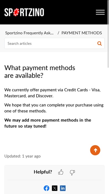 يُقدّم Sportzino للاعبين خيارات دفع لشراء حزم عملات ذهبية من المتجر، مصحوبةً عادةً بعملات سحب مجانية. تشمل الخيارات Visa و Mastercard و Discover . بعد إتمام عملية التحقق من الحساب وجمع ما يكفي من عملات السحب، يُمكنك سحب الأموال بنفس الطريقة.
