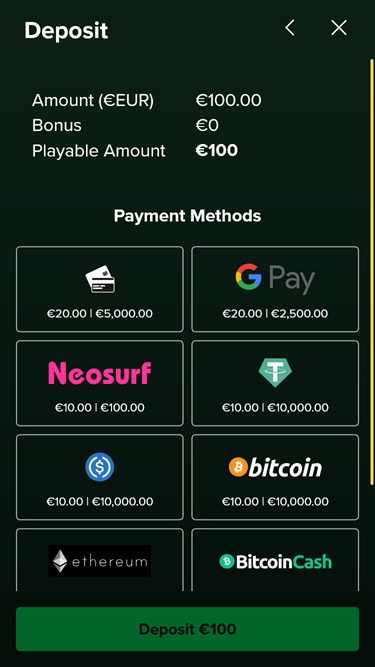 يمكن للاعبين تمويل حساباتهم من خلال خيارات دفع متنوعة، بما في ذلك Apple Pay و Google Pay والتحويل المصرفي وبطاقات الخصم والائتمان الشائعة وخيارات الدفع بالعملات المشفرة المختلفة.