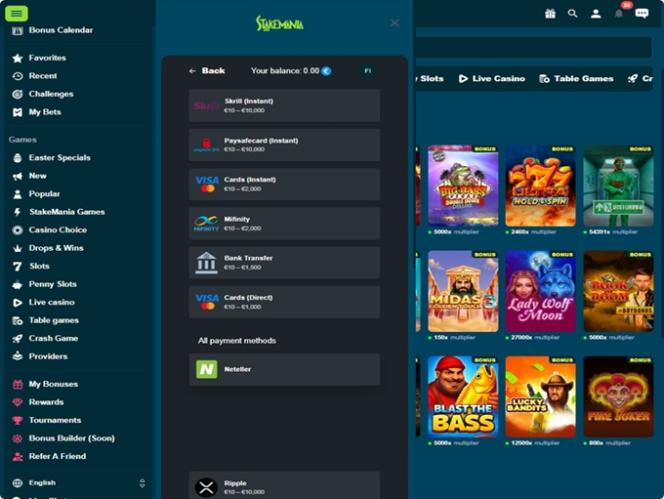 كازينو StakeMania هو كازينو إلكتروني مُوجّه للعملاء القادمين من كندا وبولندا والنرويج والدنمارك. وبالطبع، يُرجى من جميع اللاعبين الآخرين الراغبين بالانضمام إلى هذه المنصة التحقق من إمكانية تسجيل حساب جديد، إذ أن هذا الكازينو مفتوح للاعبين من العديد من مناطق المقامرة الأخرى.