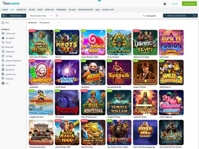 يقدم كازينو ستار العشرات من ألعاب السلوتس، بما في ذلك ألعاب الفيديو والسلوتس الكلاسيكية من نت إنت. هذا يتيح لك فرصة لعب ألعاب كلاسيكية مثل جاك هامر، وجونزو كويست، وأليينز، وسكارفيس، وغيرها الكثير. كما تتوفر جوائز كبرى متزايدة، ما يتيح لك فرصة أن تصبح مليونيرًا بنقرة واحدة.
