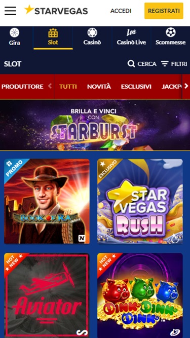 كازينو StarVegas.it مدعوم بواسطة Net Entertainment, Playtech, Espresso Games, Evolution Gaming, Habanero Systems, Novomatic, playson, Endorphina, GameArt, Pragmatic Play, Red Tiger Gaming, IGT, Kalamba, Skywind, Fazi, Eurasian Gaming, Ash Gaming, Greentube, betiXon, Capecod Gaming, Wild Streak Gaming, Rarestone Gaming, Spribe and Reel Kingdom ، وتُقدم ألعابه عبر منصة لعب فوري عبر الإنترنت، تتيح لك اللعب مباشرةً عبر متصفحك، دون الحاجة إلى تنزيل برامج ضخمة. كما يدعم اللعب عبر الهاتف المحمول، ما يتيح لك فرصة اللعب عبر هاتفك الذكي أو جهازك اللوحي.المقامرة المسؤولة ودعم العملاء والأمان