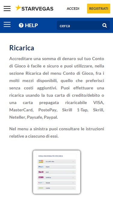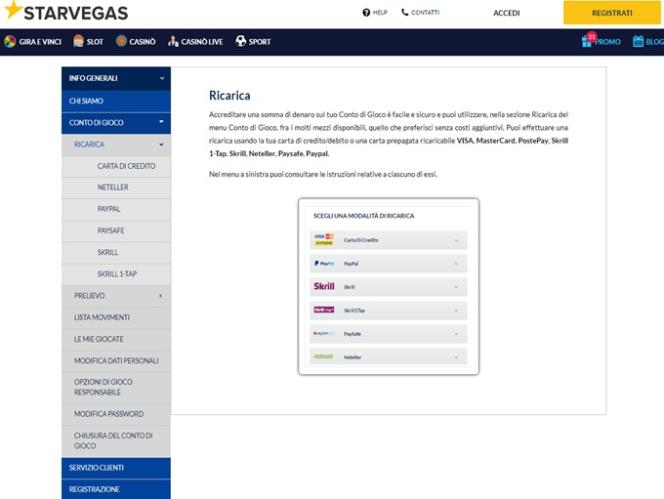 عند مراجعة الشروط والأحكام في ستار فيغاس، لم أجد أي شيء يبدو استغلاليًا، ولكني اضطررتُ لمراجعة كل شيء عبر مترجم جوجل، لذا ربما لم أتمكن من فهم كل شيء كما أراده الكازينو. النظام المصرفي جيد بما يكفي، ويسمح بالإيداع والسحب عبر فيزا، ونتلر، وماستركارد، وسكريل، وباي بال. كما يمكن الإيداع عبر أمريكان إكسبريس وباي سيف كارد. مدة صرف الأرباح 48 ساعة، وهي مدة مناسبة جدًا، ولا توجد أي حدود للسحب.خيارات الخدمات المصرفية في StarVegas.it