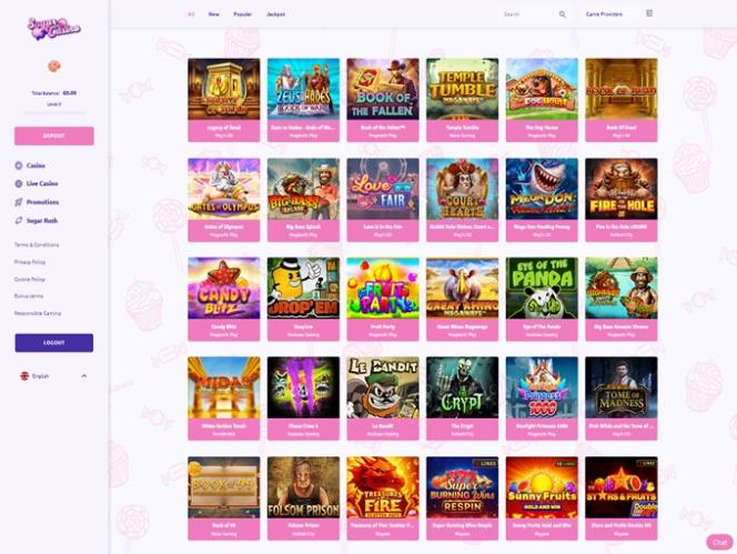 تتوفر مئات ماكينات القمار للعب في كازينو Sugar، والعديد من الألعاب متاحة عبر الموقع، حيث يقدم الموقع العديد من الميزات الفريدة، بالإضافة إلى ألعاب مستوحاة من أشهر العروض الترفيهية. كما يقدم الكازينو جوائز Microgaming التراكمية، والتي تصل جوائزها إلى ملايين الدولارات، متاحة في أي وقت.برنامج نقاط المنافسة