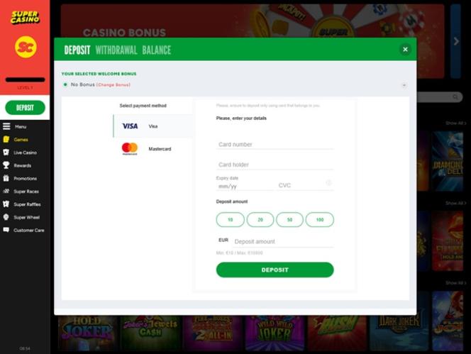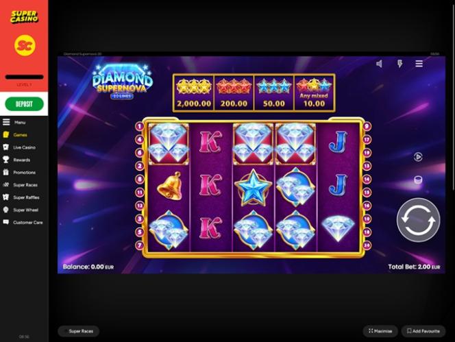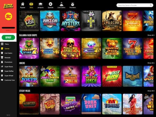 يعمل كازينو سوبر بواسطة Amaya, Microgaming, Net Entertainment, 1x2gaming, Barcrest, Big Time Gaming, ELK Studios, Evolution Gaming, iSoftBet, lightningboxgames, Novomatic, Oryx, Play'n GO, Quickspin, Relax Gaming, Thunderkick, Yggdrasil, Endorphina, Wazdan, Booming Games, Stakelogic, Pragmatic Play, Nolimit City, Felt Gaming, Red Tiger Gaming, Spinomenal, Skillzzgaming, Fantasma Games, FunFair, Kalamba, Triple Edge Studios, Northern Lights Gaming, Evoplay, Stormcraft Studios, Switch Studios, Electric Elephant Games, Pocket Games Soft, Bulletproof Games, All41 Studios, Gluck Games, Gameburger Studios, Neon Valley Studios, Golden Rock Studios, Spearhead Studios, Swintt, SpinPlay Games, HungryBear Gaming, SmartSoft Gaming, Real Dealer Studios, Blue Guru Games, On Air Entertainment, Elysium Studios, Games Global, 2by2 Gaming, Bally Technologies, bluberi, Blueprint Gaming, Greentube, NextGen, Push Gaming, Tom Horn Gaming, WMS, Inspired Gaming, Gaming Realms, SG Interactive, Gamomat, Red7Mobile, Scientific Games, Side City Studios, Reel Time Gaming, Iron Dog Studio, Old Skool Studios, Foxium, Just For The Win, Reflex Gaming, PearFiction Studios, Slingshot Studios, Golden Hero, Fortune Factory Studios, STHLM Gaming, 4ThePlayer, AvatarUX, Gamevy, Crazy Tooth Studio, NetGaming, ReelPlay, Japan Technicals Games, Alchemy Gaming, Black Pudding Games, Snowborn Games, Boomerang Studios, Hacksaw Gaming, Max Win Gaming, Gold Coin Studios, Bang Bang Games, Half Pixel Studios, Slotmill, SilverBack Gaming, Peter And Sons, Aurum Signature Studios, Lucksome Gaming, Leap Gaming, Apparat Gaming, Circular Arrow, INO Games, Atomic Slot Lab, Neko Games, Reel Kingdom, Oros Gaming, Indigo Magic, Light & Wonder and Sneaky Slots ، وتُقدم ألعابه عبر منصة لعب فوري عبر الإنترنت، مما يُغني عن البرامج القابلة للتنزيل التي تُقدمها العديد من كازينوهات بلايتك. كما يدعم اللعب عبر الهواتف المحمولة، مما يتيح للاعبين فرصة اللعب عبر هواتفهم الذكية أو أجهزتهم اللوحية.