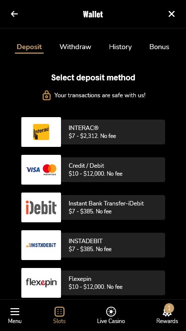 لا يفرض الكازينو أي رسوم على معاملات الإيداع والسحب.