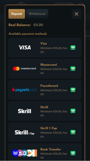 يدعم أمين الصندوق في الكازينو مجموعة ممتازة من طرق الدفع التقليدية والعملات المشفرة . يُرجى العلم أن الخيارات المتاحة تختلف باختلاف بلدك، ولكن تتوفر العديد من الخيارات الشائعة للإيداع والسحب بغض النظر عن نطاق المقامرة. تتضمن صفحة الخدمات المصرفية قائمة منسدلة تتيح لك اختيار بلدك وعملتك لعرض جميع الخيارات المتاحة في منطقتك، مع توضيح حدود كل منها.