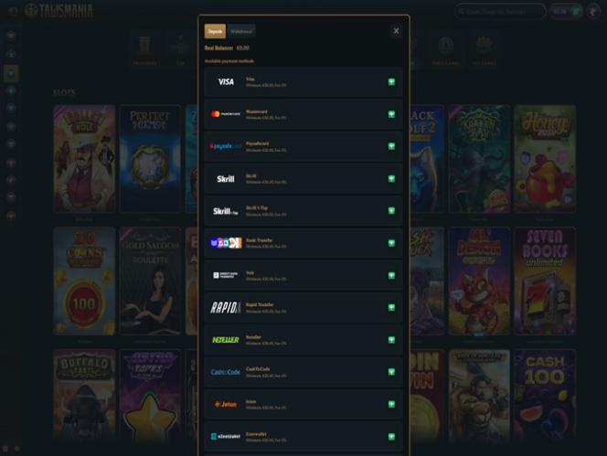 كازينو Talismania هو كازينو على الإنترنت ومشغل للمراهنات الرياضية وهو مملوك لشركة ذات خبرة أنشئت بموجب قوانين كوراساو، ومرخصة ومنظمة من قبل حكومة كوراساو.