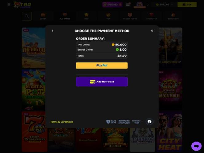 كما هو الحال مع العديد من الكازينوهات الاجتماعية الأخرى، يقدم TaoFortune عملتين افتراضيتين مميزتين يمكنك استخدامهما لتجربة جميع الألعاب الرائعة التي يقدمها. بدايةً، هناك عملات TAO، وهي عملة تُستخدم للعب بدافع المتعة ولا تمنحك أي جوائز حقيقية.